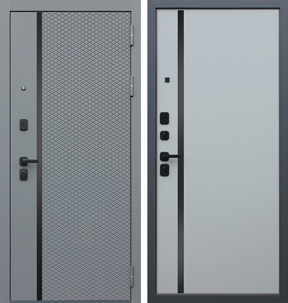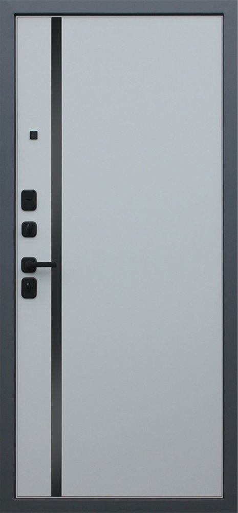 Порошковое покрытие Муар Серый Экошпонированная панель МДФ 10 мм (дизайн ФЛС). Цвет "ясень графит". Объемная фрезеровка. Вертикальная вставка из черного глянцевого лакобеля. Наличник МДФ 80 мм.